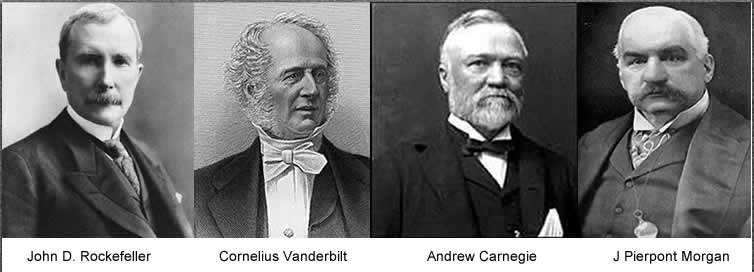 (上圖由左至右分別是19世紀(jì)末的美國(guó)“石油大王”約翰·洛克菲勒、“鐵路大王”康內(nèi)留斯·范德比爾特、“鋼鐵大王”